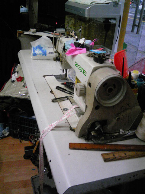 散歩の途中、店の前を通る時はいつもミシンに向かって